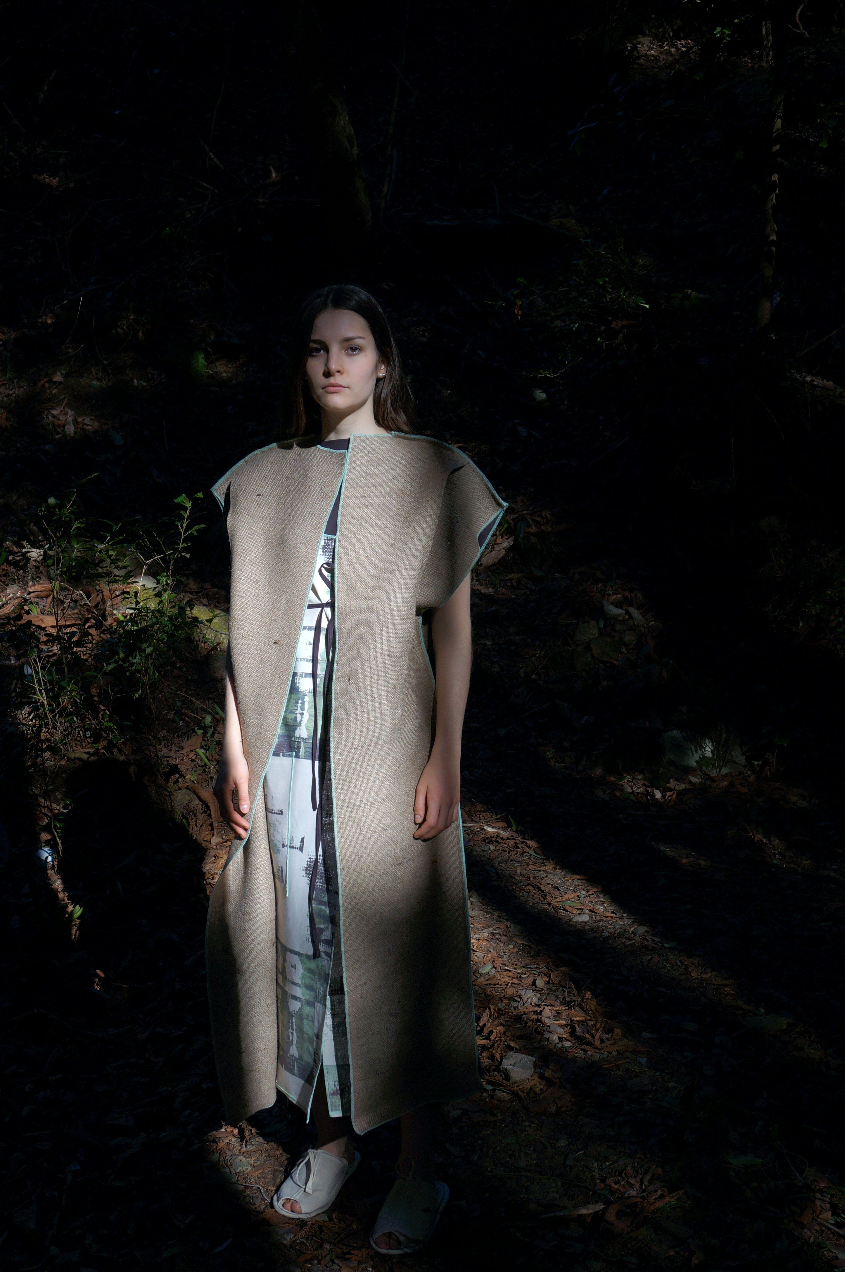 “En 2016-2017, j’étudiais un an à Tokyo, loin de mon village natal et de ma famille. Cette distance est racontée dans cette collection, sous forme de fragments de ruralité et de paysages suggérés. Les volumes sont des hybrides, entre le costume du paysan japonais traditionnel, et l’uniforme du paysan que je connais dans l’Ouest de la France. Vêtements-ruines ou tissus-mémoires, Exode propose de constituer un vestiaire par une récolte de souvenirs.”